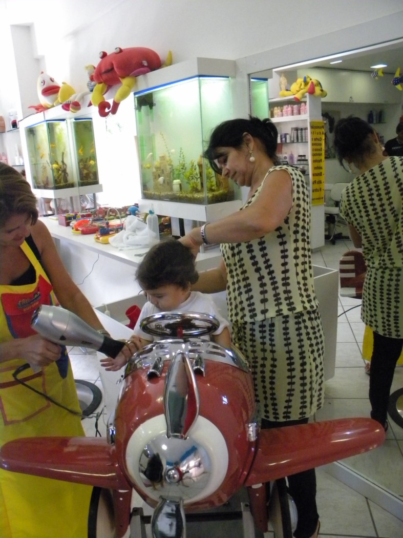 E ele foi um lord. Claro que o salão era completamente equipado para crianças, brinquedos até no teto, uma cadeira em formato de avião, ajudantes com aventais coloridos, aquários, isso ajudou bastante. Não dá pra levar um bebê de 1 ano em qualquer salão, e esse valeu cada um dos (muito) centavos que paguei. Ela conseguiu cortar tranquilamente, eu tirei foto de tudo. Olha: